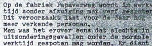 En wat meldt de VGW-commissie op 5 juli, minder dan een maand later? Verfspuiten in de productiehal. De tekst van het schrijven spreekt, hoe beleefd ook geformuleerd, voor zich. De VGW-commissie kiest voor een onorthodoxe weg: direct overleg met de afdelingsleiding van productielijn en schilderswerkplaats. Voor het eerst gaat het gesprek ook over ‘chromaatloze verven en primers’, bronaanpak in arbojargon. ‘Constructief overleg’ constateert de commissie, en dat levert 30 augustus nieuwe principeafspraken op. Edoch, als OR-leden op 7 september poolshoogte gaan nemen bij de avondploeg (dat doen ze vaker), blijkt er toch weer gespoten te zijn, en is slechts een klein deel van de gemaakte afspraken uitgevoerd.