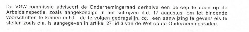 Die expertise komt kort daarna goed van pas, als blijkt dat het overtreden van afspraken nog steeds structureel is. De VGW-commissie brengt in september rapport uit aan de Ondernemingsraad met een lange cc-lijst: alle directeuren, betrokken managers, deskundigen krijgen een kopie, zodat ze (kunnen) weten waar ze aan toe zijn. Alles overziend adviseert de commissie namelijk een volgende stap: inschakelen van de Arbeidsinspectie door middel van een toen nog in de Arbowet opgenomen ‘Verzoek tot Wetstoepassing’.
