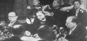 Ondertekening Soevereiniteitsoverdracht aan Indonesië op 27 december 1949 in het Paleis op de Dam in Amsterdam. In het midden koningin Juliana, links Mohammed Hatta, rechts Willem Drees.