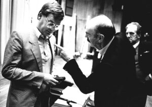 Congres van de Dienstenbond in 1985: Freek Thomasson (links) … zou ervoor zorgen dat het congres nieuwswaarde kreeg…