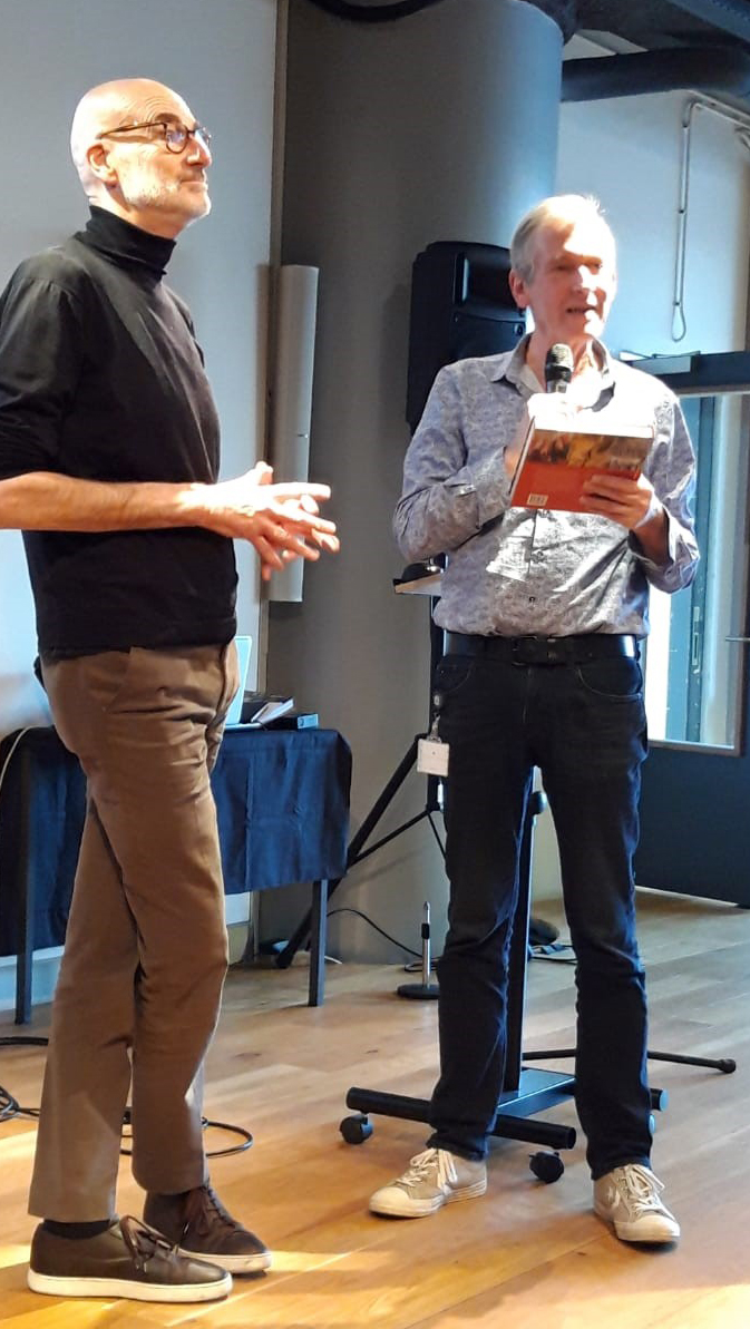Sjaak van der Velden (rechts) bij de presentatie van Het Grote Stakersboek op 12 februari 2020. Links directeur Henk Wals van het Internationale Instituut voor Sociale Geschiedenis (IISG)