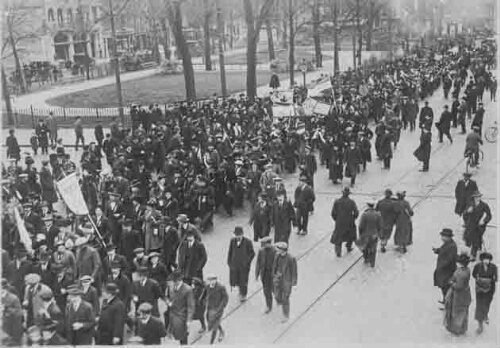 Betoging voor algemeen vrouwenkiesrecht 1916 (Bron: Collectie Atria). Opvallend: het grote aantal mannelijke deelnemers.