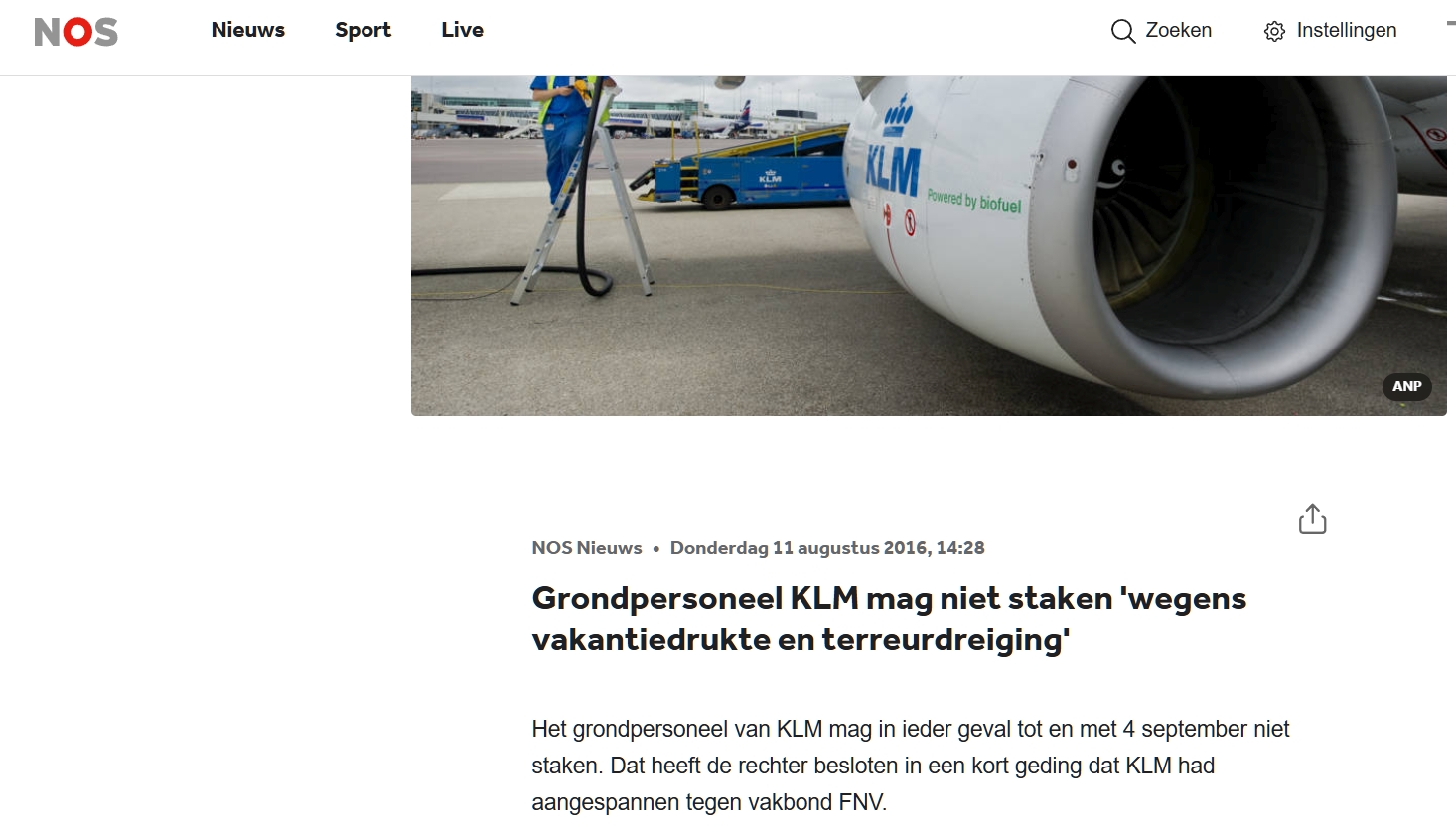 • 26 augustus: in hoger beroep handhaaft het Gerechtshof Amsterdam het eerder uitgesproken stakingsverbod voor KLM Grondpersoneel. Meer weten…