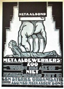 Ministers, parlementsleden en de Koningin hielden zich bezig met staatszaken. De werkende klasse had in 1922 andere zorgen aan het hoofd. De Kerstdagen van 1921 en de jaarwisseling 1921-1922 moeten zwaar zijn geweest voor de duizenden arbeiders in de metaalsector die al twee maanden staakten. Inkomensverlies voor het gezin, voor zover al niet van toepassing vrouw en kinderen die er buitenshuis bij gaan werken om rond te komen, onzekerheid over de toekomst. Het leek er niet op dat de bonden de staking zouden kunnen volhouden. Op 9 januari 1922 eindigt de staking in de metaalsector die op 31 oktober 1921 was begonnen. De aanleiding voor het grote arbeidsconflict was een aangekondigde loonsverlaging oplopend van 10 tot 15 percent. In Mensenwerk lezen we hierover dat er 15.000 arbeiders deel van uitmaakten onder wie 7000 ongeorganiseerden. Bij de staking waren alle stromingen voor korte of langere tijd betrokken: de grote Algemene Nederlandse Metaalbewerkersbond (foto), de middelgrote Christelijke Metaalbewerkersbond, de katholieke bond “St. Eloy”, de Landelijke Federatie van Metaalbewerkers en de kleine Nederlandse Neutrale Bond van Metaalbewerkers. Van de opkomende economische crisis begin jaren twintig maakten de werkgevers gebruik door de vakbeweging in het defensief te dringen. Na de eerste afgesloten collectieve arbeidsovereenkomst in de metaal in 1919 duurde het maar liefst tien jaar voordat werkgevers en vakorganisaties in de sector de volgende cao afsloten.
