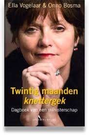 Ik ontmoette Ella in het echt op 13 november 2007 bij Pauw & Witteman toen ze minister van Wonen, Wijken en Integratie was. Ze had net haar Integratienota ingediend. Een nota waar in duidelijk werd dat er plaats moet zijn voor meerdere overtuigingen en culturen. Geen strenge aanpak zoals Rita Verdonk (VVD) dat en deed en ook niet wat Henk Kamp (VVD) wilde een strengere aanpak van immigranten en over Wilders (PVV) maar te zwijgen. Ik zat in het publiek en Ella zat aan tafel met o.a. Jort Kelder die in zijn roze bretels over de PC Hooftstraat mocht vertellen. En Heleen van Royen die een jurkje aan had wat twee maten te klein was mocht haar Glossy promoten. Deze twee hadden er plezier in de minister onderuit te halen daarin gesteund door Pauw. Ella klapte dicht, ze werd er ziende chagrijnig van. Ze herhaalde nog maar eens dat het beter is te kijken hoe je met verschillen kunt samenleven in plaats van allemaal het zelfde zijn. Na afloop schiet ik haar aan. Ooit waren we collega’s. Je moet wat meer van je afbijten zeg ik. Met een wat trieste glimlach zegt ze het te harte nemen. Later in het boek ‘Twintig maanden knetter gek”, beschrijft haar partner Onno Bosma die avond ( blz.137-138) keffertje Kelder en nitwitje van Royen. Het was geen leuke avond voor Ella Vogelaar en ik had het met haar te doen.