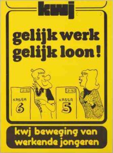 In de jaren ’60 verandert dat. NVV-Jongerencontact, en aan katholieke zijde de KWJ, staan op voor de belangen van werkende jongeren, met leuzen als ‘Jeugdloon is diefstal’ en acties tegen de in die jaren sterk groeiende jeugdwerkloosheid.