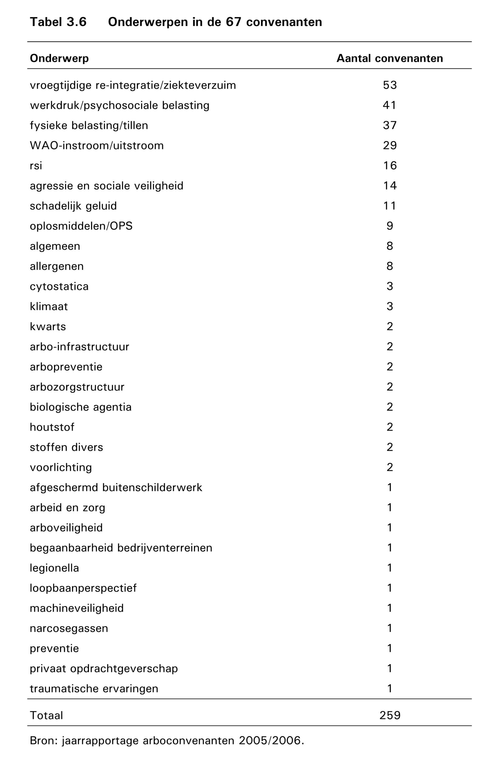 Slechts 19 van de 31 onderwerpen in de tabel zijn ondubbelzinnig te typeren als directe arbeidsrisico’s, die gevaar kunnen opleveren voor veiligheid en gezondheid van werkenden. Daarbij zijn twijfelgevallen als ‘afgeschermd buitenschilderwerk’ en ‘begaanbaarheid terrein’ meegerekend. In totaal zien we in 67 convenanten afspraken, bij elkaar opgeteld over 269 onderwerpen. Maar daarvan zijn er slechts 169 (65%) te typeren als afspraken over een arbeidsrisico.