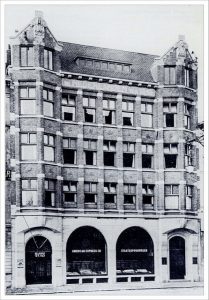 “Onlangs was het weer zover. Deze keer werd de lezing voorafgegaan door een rondleiding door en om het gebouw. Jan Tielen hield de aanwezigen ruim een uur geboeid en vertelde vele, maar helaas bij lange na niet alle details uit de rijke geschiedenis van de diamantbewerkersbond en haar gebouw. Buiten liet hij zien hoe de ontwerper, Berlage, de burcht bijna letterlijk vormgaf met kantelen en een toren. Toen ging er bij mij een lampje branden. Had Berlage niet een soortgelijk gebouw ontworpen voor de Rotterdamse arbeidersbeweging? Een foto van dat gebouw aan de Slaak dat in de vlammen van 1940 was ten ondergegaan had ik toch onlangs ergens gezien?